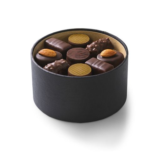 RDT3443986Coffret Allure personnalisé avec 18 bonbons de chocolat : 3 palets fourrés ganache caramel et fleur de sel de Guérande, 4 buchettes chocolat praliné aux éclats d'amandes Valencia, 3 palet fourré ganache chocolat noir intense au cacao du Vénézuela, 4 bonbon praliné amandes et amande entière, 4 lingot parliné noisette et crêpe dentelle de Bretagne