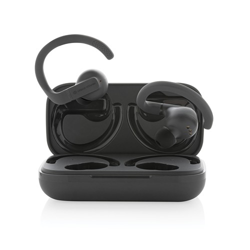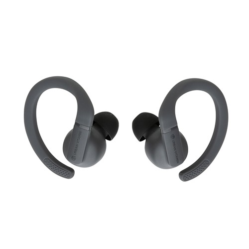 RDT2685054Écouteurs d'entraînement avec crochets d'oreille personnalisables et parfaitement ajustables, plusieurs options d'embouts pour un confort accru. Légers, ils sont conçus pour des performances optimales, avec une conception robuste pour une résistance à la sueur, à la poussière et à l'eau conforme à la norme IPX5. Avec jusqu'à 8 heures d'écoute grâce à la technologie avancée BT 5.3 dans chaque écouteur et un son puissant et équilibré, vous aurez toujours votre musique pour vous motiver. Les écouteurs et l'étui de charge de 600 mAh sont fabriqués avec de l'ABS/TPE recyclé certifié RCS (Recycled Claim Standard). Contenu recyclé total : 55 % sur la base du poids total de l'article. La certification RCS garantit une chaîne d'approvisionnement entièrement certifiée pour les matériaux recyclés. Les oreillettes peuvent être rechargées 3 fois complètement dans l'étui de chargement. Les articles Urban Vitamin sont fabriqués sans PVC et emballés dans des emballages à faible teneur en plastique. Conforme à la directive des équipements de télécommunication et radio 2014/53/EU, Conforme à la directive des subtances dangereuses 2011/65/CE et 2015/863, Fiche de données de sécurité du produit disponible, Conforme à la réglementation REACH et ZEK 01-4-08 de teneur en PAHS, Conforme à la directive de teneur en Phtalate, Pas de matériaux PVC utilisés, Conforme à la directive de sécurité de transport des batteries, Certificat pour transport aerien, Sans paraffines chlorées à chaine courte et moyenne