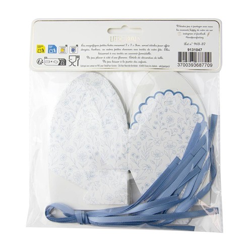 RDT3499424PETITES BOITES A FESTONS FLEUR BLEUE X 8 Jolies petites boites festonnées, à dragées, à bonbons ou chocolats, avec un motif floral vintage et un galon bleu façon porcelaine de Limoges. Parfaites pour une décoration de table vintage très "fleur bleue". Romantique à souhait, cette gamme évoque nos souvenirs d'enfance entre toile de Jouy et porcelaine de Limoges.