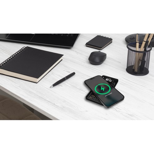 RDT2893681Batterie de secours en rubber avec logo lumineux et technologie MagSafe qui permet à la batterie d’être aimantée au téléphone et le recharger ainsi par induction. La technologie de ce powerbank se découvre et laisse apparaitre son circuit.