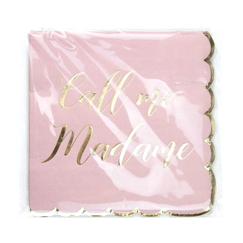 RDT3499711SERVIETTES FESTONNÉES 33X33CM "CALL ME MADAME" X 16 Jolies serviettes 18gr festonnées rose poudré avec un print graphique doré " Call me Madame", tout juste parfaites en décoration sur une table pour un EVJF ou un lendemain de mariage.