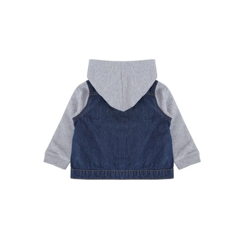 RDT3354891Veste en jean avec manches et capuche contrastées. Fermeture par boutons pression. 2 poche poitrine avec rabat. Surpiqûres jaunes. Bords côtes aux manches. Coutures épaules orientées vers l'avant. Col mantant.